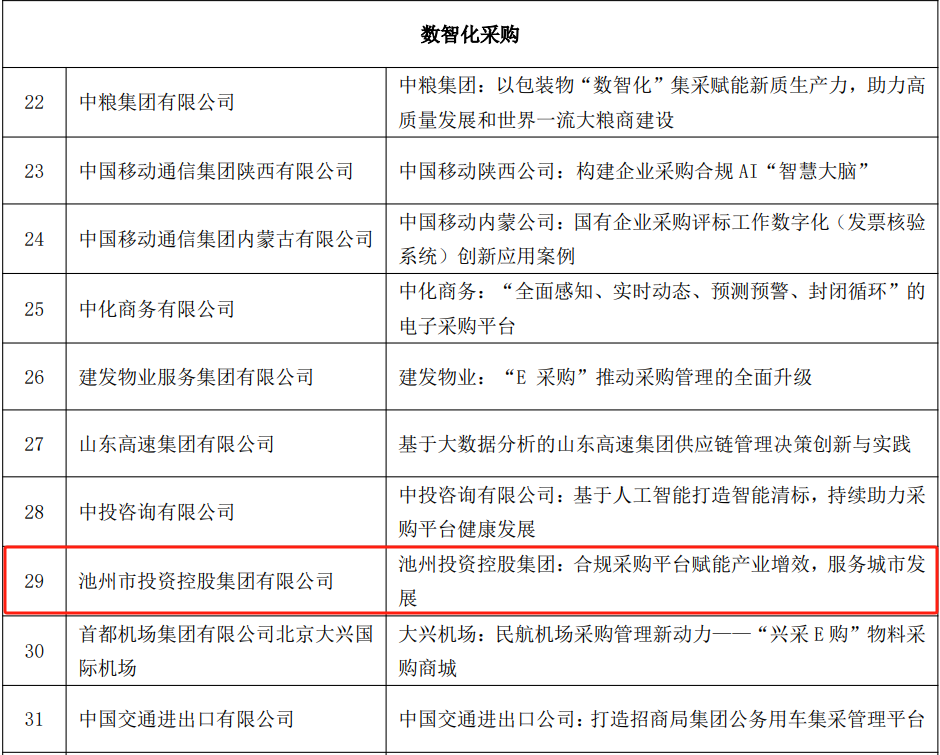 近日,中國物流與采購聯(lián)合會公共采購分會面向國企采購領域征集優(yōu)秀案例活動公布了評審結果,池州市投資控股集團有限公司合規(guī)采購平臺以“合規(guī)采購平臺賦能產業(yè)增效,服務城市發(fā)展”為題,獲評2024年度全國公共采購數(shù)智化采購優(yōu)秀案例。