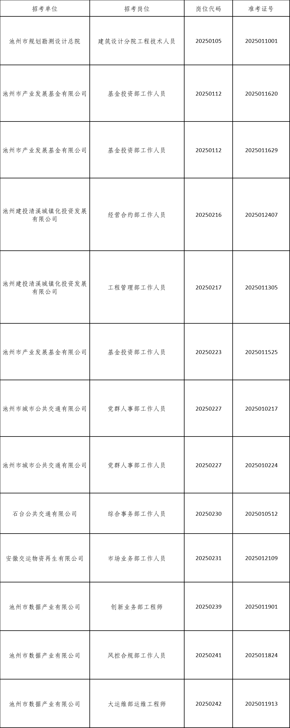根據(jù)《池州市投資控股集團(tuán)2025年公開(kāi)招聘工作人員公告》要求,由于入圍現(xiàn)場(chǎng)資格復(fù)審的考生中有部分人員自動(dòng)放棄或不合格產(chǎn)生了人員空缺,現(xiàn)按《公告》要求,在報(bào)考同崗位的考生中按筆試成績(jī)從高分到低分的順序依次遞補(bǔ),成績(jī)出現(xiàn)并列者一并進(jìn)入資格復(fù)審,現(xiàn)將入圍遞補(bǔ)資格復(fù)審情況公告如下: