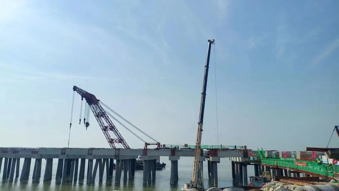 前期工作已完成,PHC管樁及鋼管樁已施工完成,引橋灌注樁施工124根,完成總量的97%,下橫梁施工完成,預(yù)制梁安裝完成84%,預(yù)制板安裝完成70%,上橫梁施工完成61%,現(xiàn)澆面層完成7%,水下拋石完成41%。