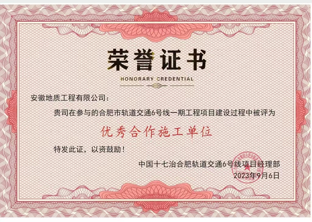 近日,建投集團所屬安徽地質工程有限公司喜獲中國十七冶合肥軌道交通6號線項目經(jīng)理部頒發(fā)的“優(yōu)秀合作施工單位”榮譽稱號,這是對地質工程公司在該項目施工過程中的突出表現(xiàn)的肯定。