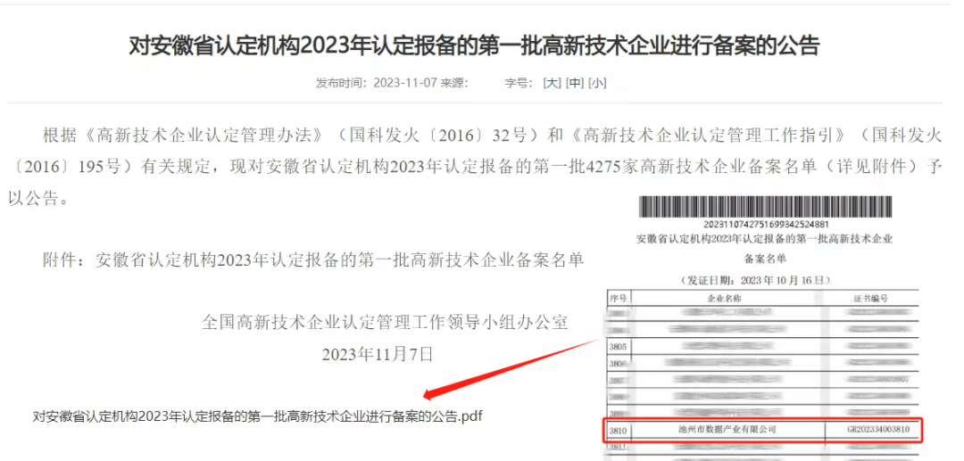 11月7日,全國高新技術(shù)企業(yè)認(rèn)定管理工作領(lǐng)導(dǎo)小組辦公室發(fā)布《對(duì)安徽省認(rèn)定機(jī)構(gòu)2023年認(rèn)定報(bào)備的第一批高新技術(shù)企業(yè)進(jìn)行備案的公告》,池州市數(shù)據(jù)產(chǎn)業(yè)有限公司名列其中,榮獲2023年度第一批認(rèn)定的高新技術(shù)企業(yè)。