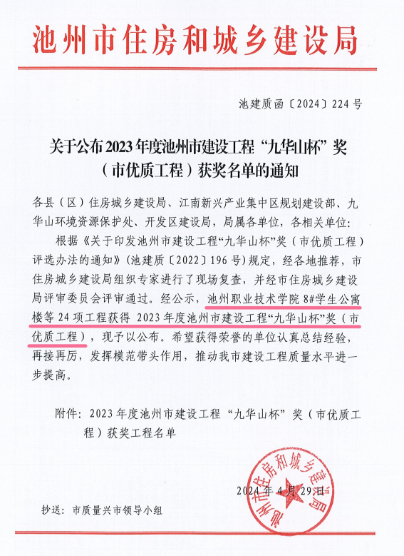 近日,池州市住房和城鄉(xiāng)建設局印發(fā)了《關于公布2023年度池州市建設工程“九華山杯”獎(市優(yōu)質工程)獲獎名單的通知》(池建質函〔2024〕224號),由池州建投集團承建的池州職業(yè)技術學院8#學生公寓樓項目喜獲2023年度池州市建設工程“九華山杯”(市優(yōu)質工程)獎。