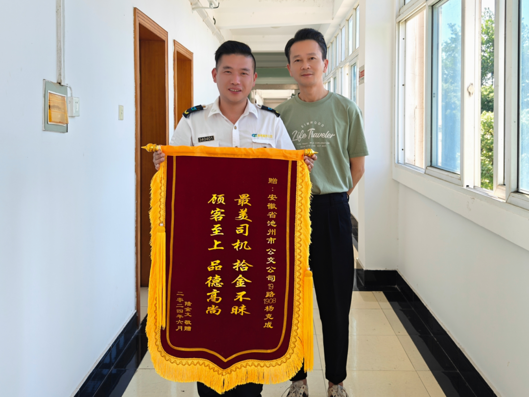 6月25日下午,池州市城市公共交通有限公司收到了乘客陸先生從河北郵寄來的一面錦旗。6月23日早上7:40分,城市公交客服熱線接到了乘客陸先生打來的電話,陸先生表示自己的手機和身份證丟了,半小時前乘坐過19路公交車。調(diào)度員在了解情況后立刻通過調(diào)度系統(tǒng)鎖定車輛并聯(lián)系公交師傅。楊克成師傅在靠站后找到了一個手機和一個身份證,立刻拍照發(fā)給調(diào)度中心進行了核實,并對物品進行了保管。上午10:30分,陸先生在1908車楊克成師傅手上接過了自己遺失的手機和身份證,激動萬分,表示手機里的文件非常重要,能夠這么快完好無損的找回來自己很開心,非常感謝楊師傅。楊師傅表示“拾金不昧,物歸原主”是自己作為駕駛員應(yīng)該做的,哪怕是一根針一根線我們找到了都會保管好還給乘客。